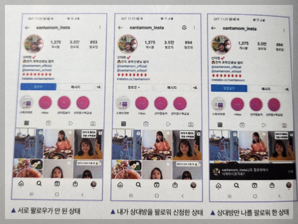 팔로잉: 팔로우하고 있는 상태. 내가 친구로 추가한 사람, 내가 다른 계정을 팔로우하면 팔로잉 상태로 바뀐다.